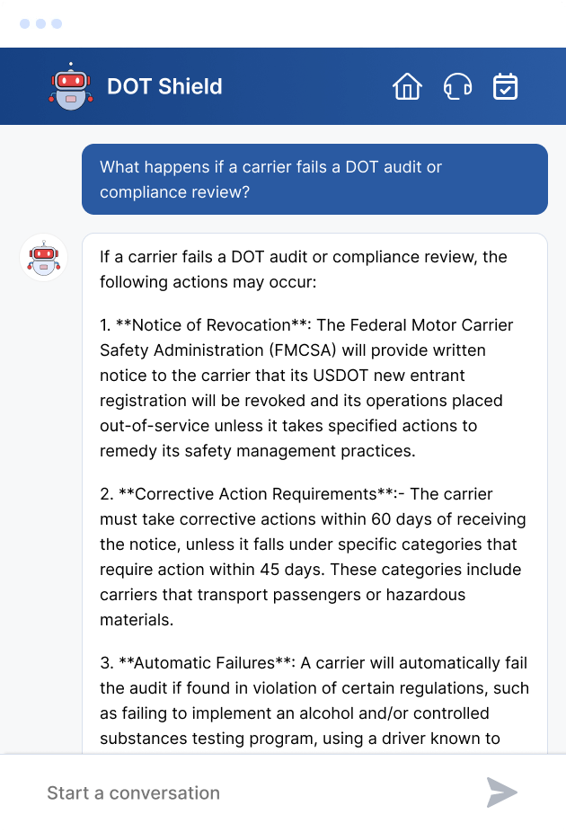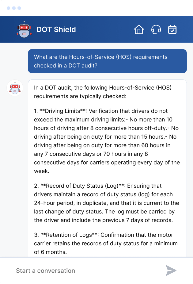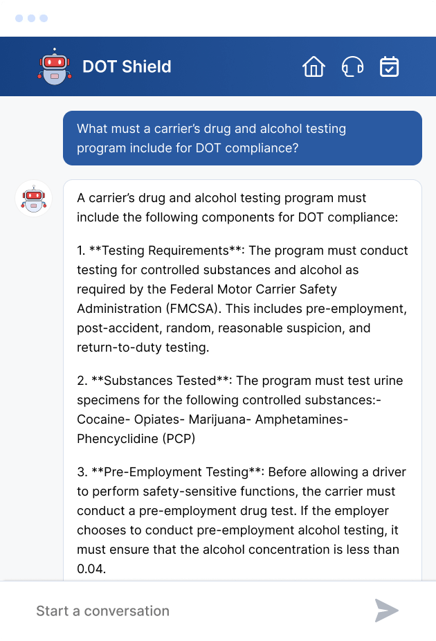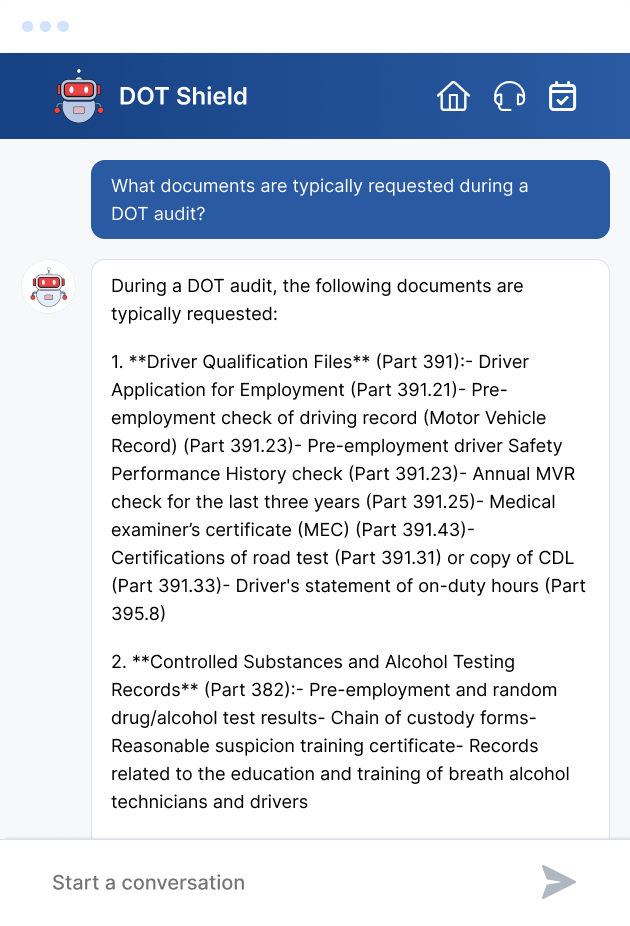 - Complex DOT Q&A with CFR citations: Handles nuanced, multi‑factor questions across 49 CFR Parts 382, 383, 387, 390–399 and relevant HazMat sections 171–180. Returns a clear answer plus source sections for verification. (Not legal advice.)