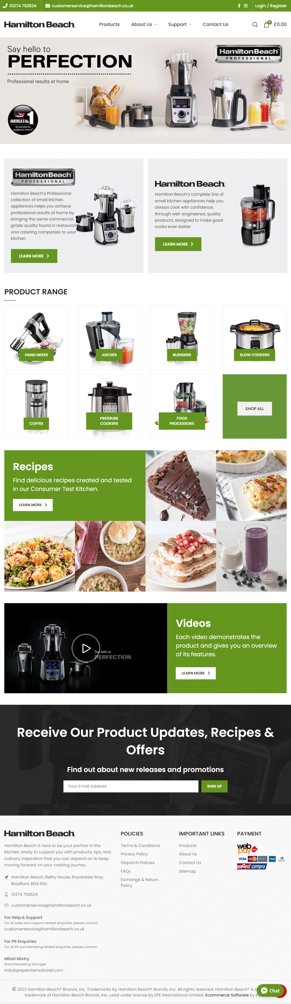 Hamilton Beach UK’s website sells high-quality kitchen appliances such as coffee makers, stovetop cookers, motor hand mixers, blenders, dicer, and chopper. All products are listed with detailed and accurate descriptions of the products along with features and photographs so the customers can make an informed purchase decision. Hamilton Beach UK has videos with a vibrant visual tour of features of the products and demonstration of their functions.