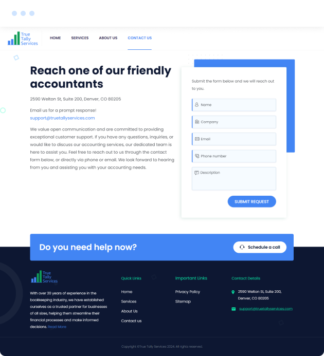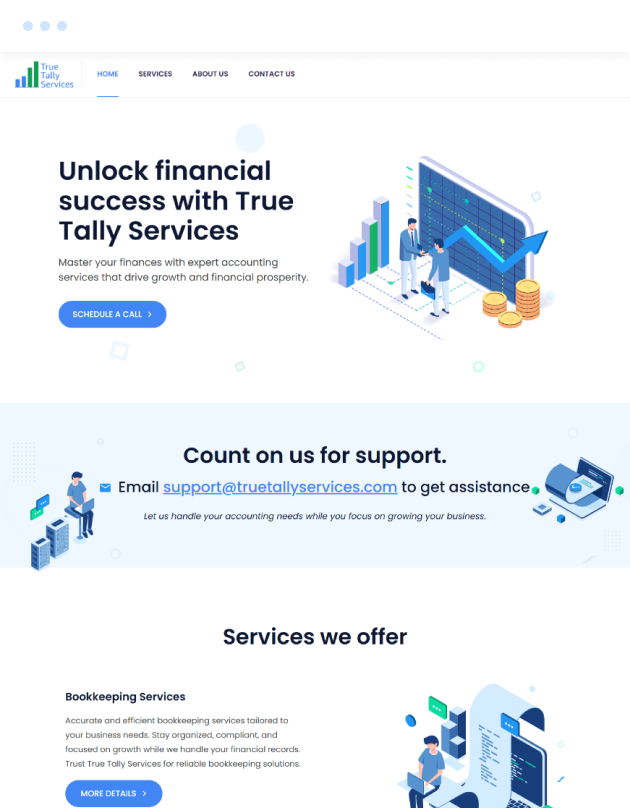 - Custom Design: We designed a sleek, professional website that aligns with True Tally Services’ branding, ensuring a visually appealing interface that resonates with their audience.